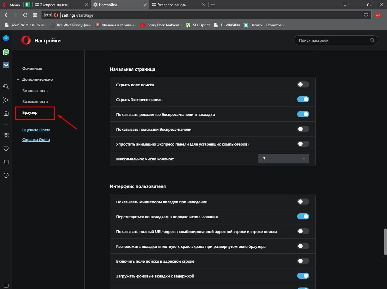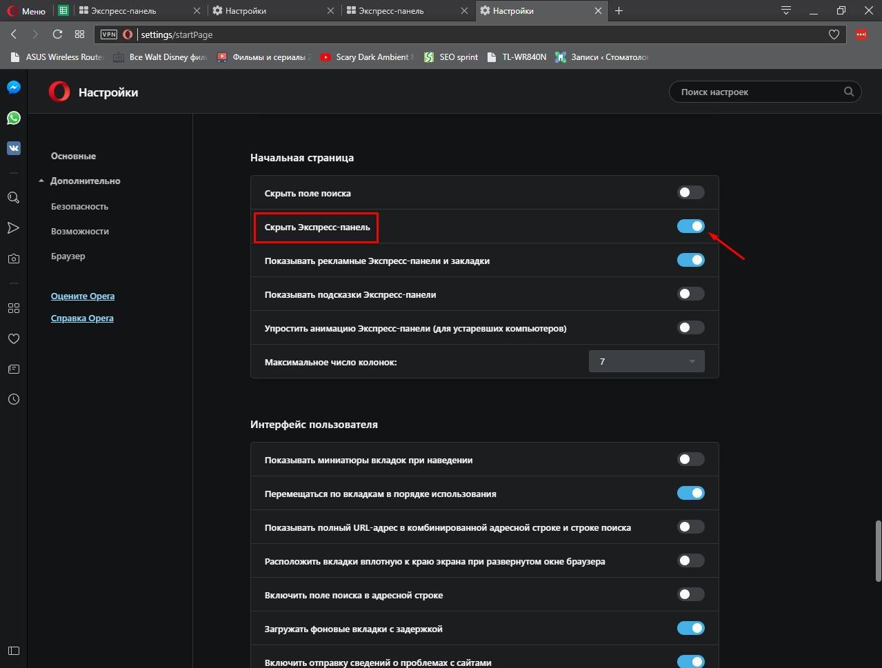 В разделе с заголовком «Начальная страница» отключаем «Скрыть Экспресс-панель»