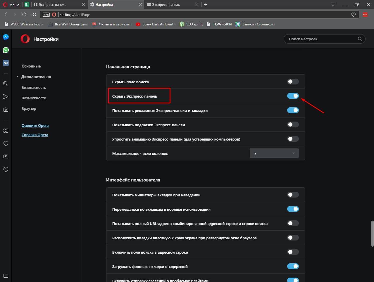 Активируем «Скрыть Экспресс-панель», чтобы она исчезла с главного меню на экране в браузере