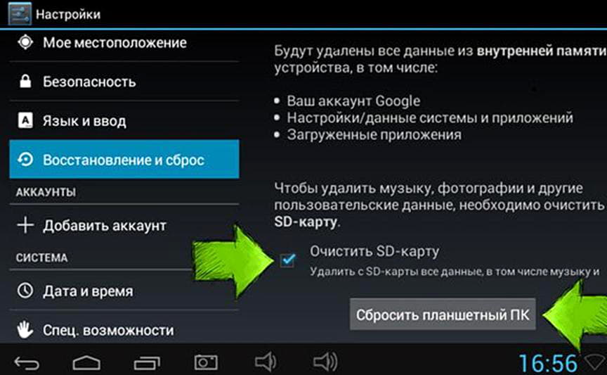 Если планшет хоть как-то работает, можно попробовать сделать это из его системного меню настроек, но проще — всё из того же recovery, только теперь вам нужен пункт «wipe data/factory reset». Кстати, после применения данного метода, кэш тоже будет полезно почистить.
