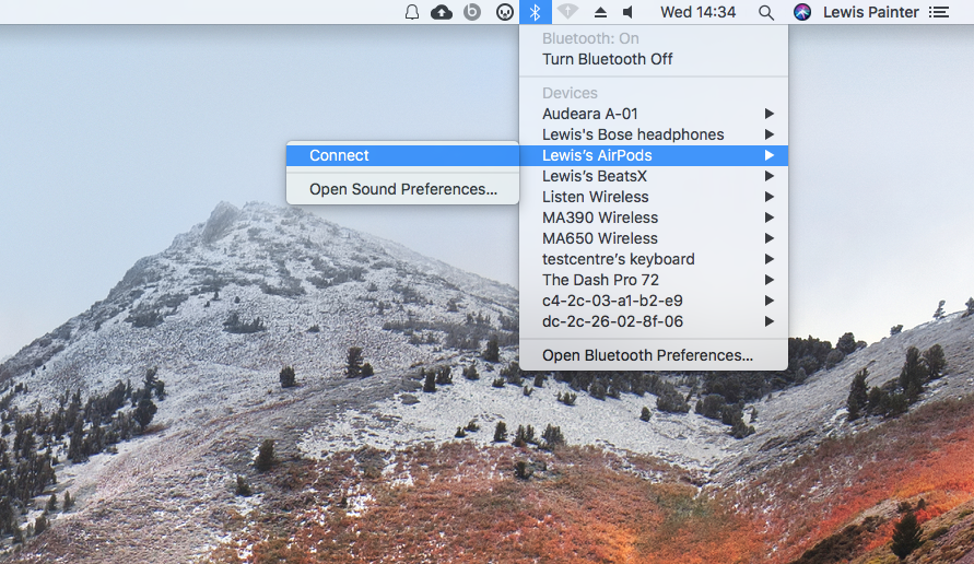 Чтобы проверить, так ли это, просто вставьте ваши AirPods в уши и выберите значок Bluetooth в строке меню вашего MacBook. Если AirPods действительно появляются в списке устройств, просто нажмите на них, чтобы подключиться.