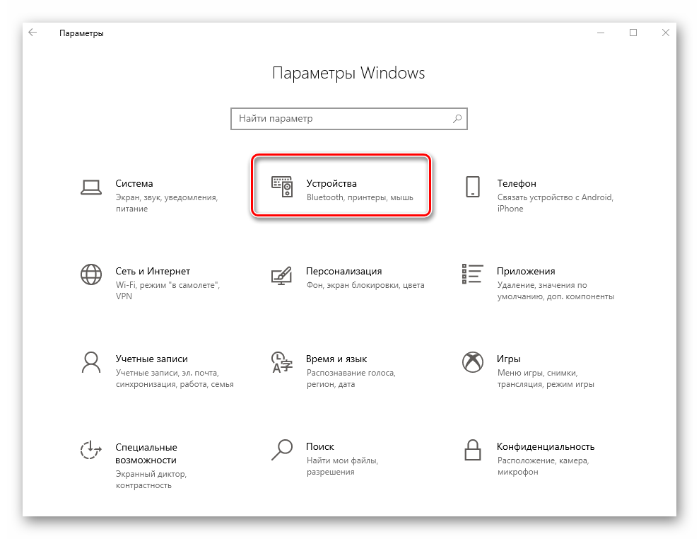 - Нажмите на клавиатуре одновременно «Windows»и «I». Таким образом вы откроете стандартное окно «Параметры». В нем кликните по разделу «Устройства».