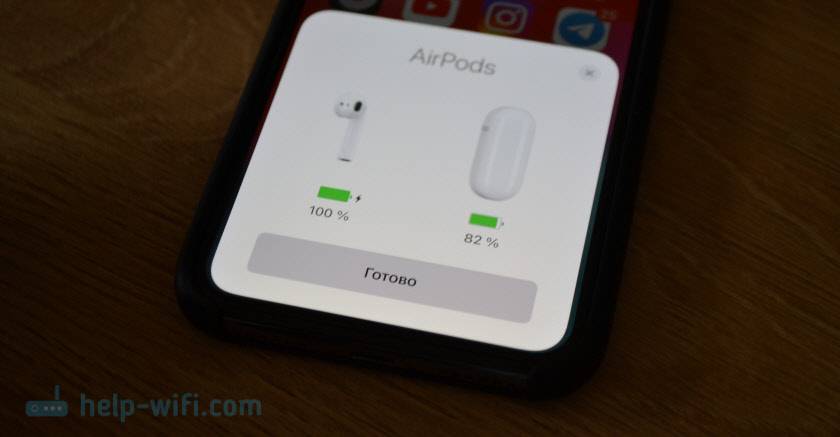 Индикатор на кейсе загорится зеленым цветом, а на Айфоне появится информация о подключенных наушниках (уровень заряда наушников и футляра).