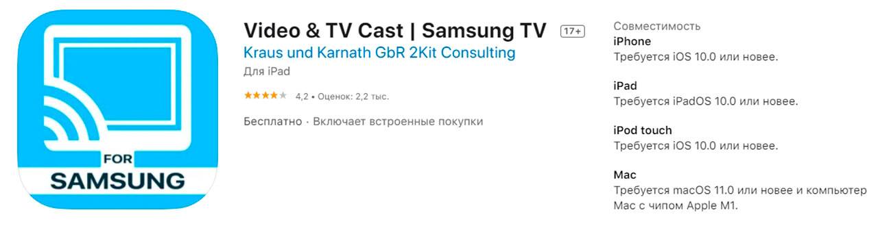 Это приложение для сопряжения айфона с телевизорами Samsung, разработанное специально для ТВ-приемников этой марки. Трансляция осуществляется при беспроводном соединении, никаких кабелей не требуется.