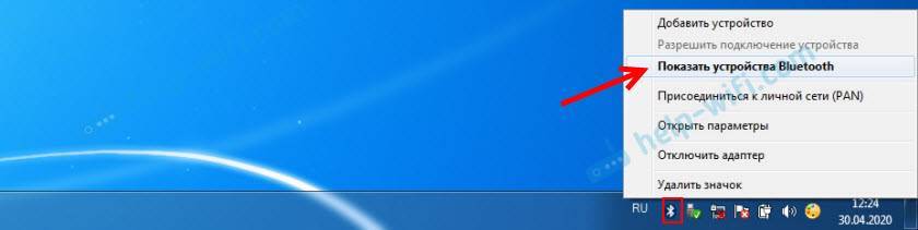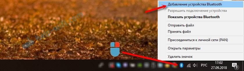 Для подключения нажмите правой кнопкой мыши на иконку Bluetooth и выберите “Добавление устройства”.