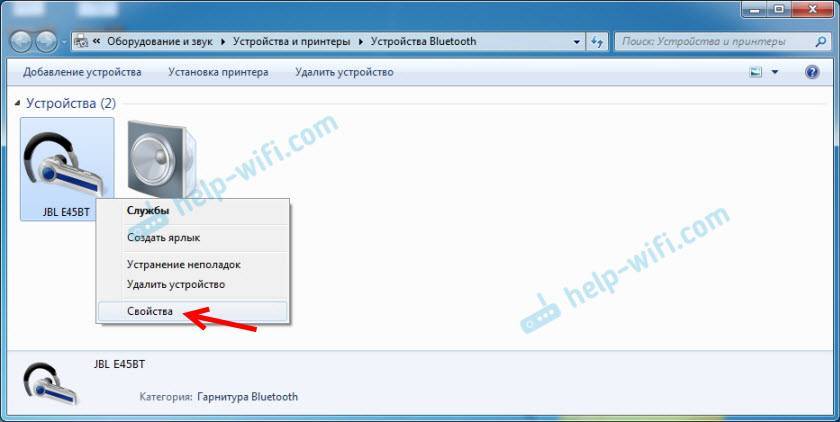 Бывает, что в настройках звука не удается переключить звук на “Bluetooth Headphones” (стерео наушник), или связь (микрофон) на “Bluetooth Headset”. Или плохой звук в наушниках. В таком случае нужно проверить службы в свойствах наушников. Для этого откройте “Устройства Bluetooth”.