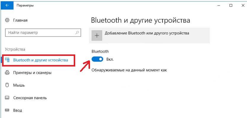 3 На вкладке «Bluetooth и другие устройства» включаем беспроводной адаптер (если он отключен), и нажимаем на «Добавление Bluetooth или другого устройства».