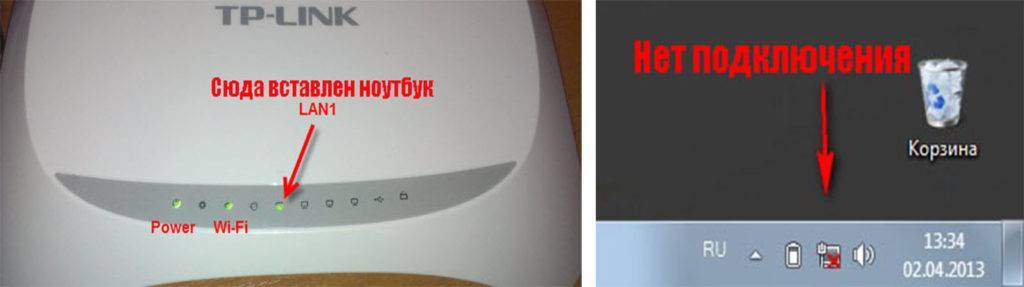 После того как патч-корд вставите в оба устройства, увидите на роутере загораться светодиод. А на ПК исчезнет красный крестик в нижнем правом углу. Теперь можно приступать вносить настройки на компьютер.