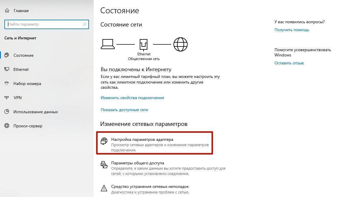В появившемся окне нажмите «Настройка параметров адаптера».