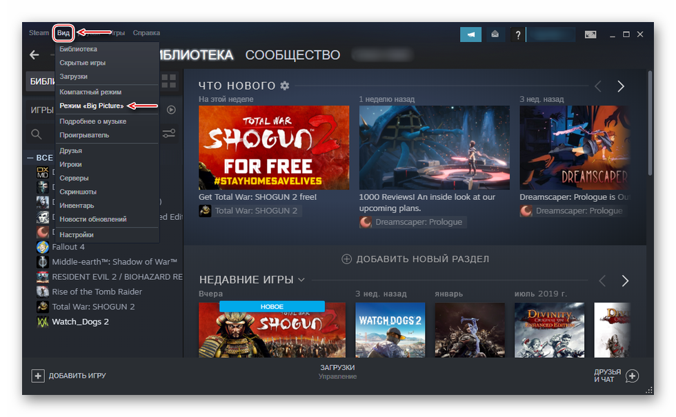 - Открываем Steam, переходим во вкладку «Вид» и выбираем «Режим Big Picture», разработанный для того, чтобы удобнее было запускать платформу на телевизорах и управлять ею с помощью геймпада.