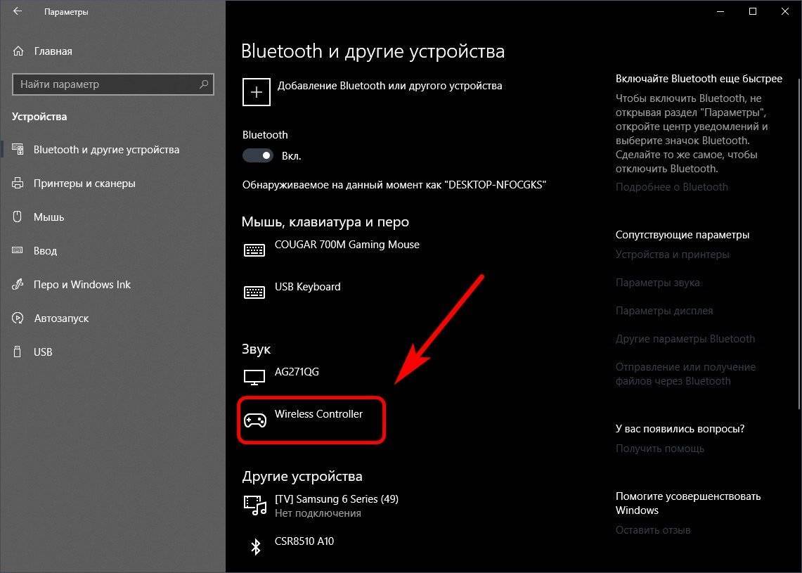 Система самостоятельно определит устройство и установит драйверы, необходимо только подключение к сети Интернет. Убедиться в том, что система правильно определила устройство, можно так: зайти во «Все параметры» — «Устройства» — «Bluetooth и другие устройства» и посмотреть там. В списке устройств вы обнаружите «Wireless Controller». Это если у вас Windows 10, если Windows 7, то откройте «Пуск», затем «Устройства и принтеры», там ищите все тот же «Wireless Controller»
