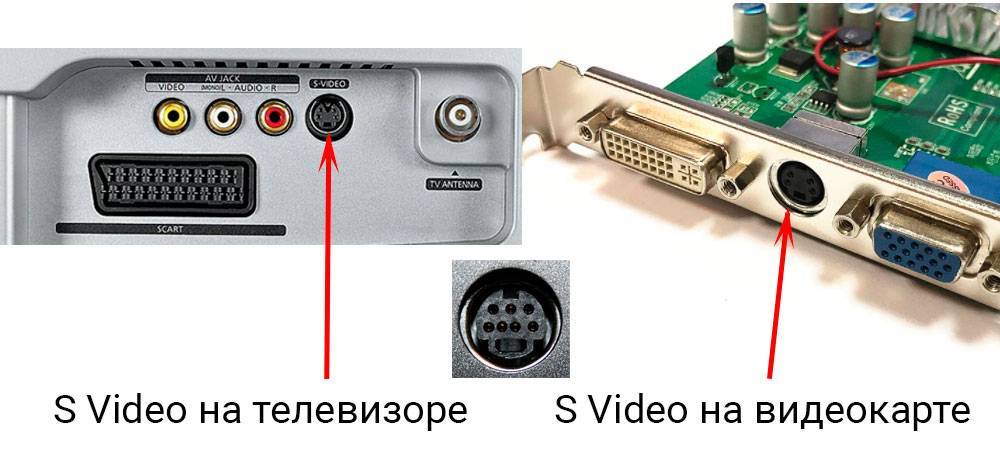 - S-video. Выход представлен в виде круга. Имеет 4 или 7 контактов. Вероятность встретить такой выход на ноутбуке крайне мала. Сейчас его практически не используют. В основном встречается в стационарных компьютерах. Он хорошо передает изображение, но уже используется мало;