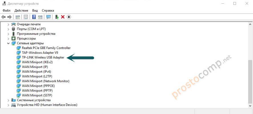 Адаптер должен появится в диспетчере устройств. В его названии скорее всего будут слова WLAN, Wireless, 802.11. Или будет название компании производителя. Как в моем случае, адаптер от TP-Link.