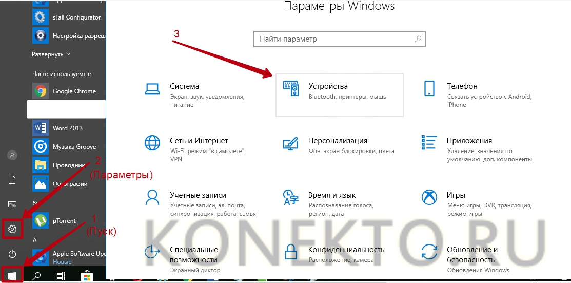 Открыть меню «Пуск», перейти в «Параметры» и выбрать раздел «Устройства».