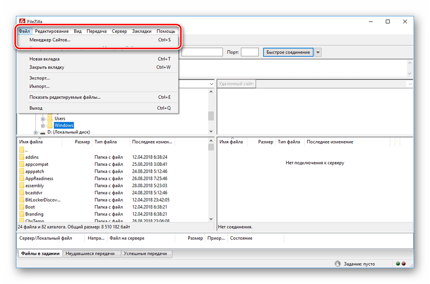 - Отройте FileZilla, перейдите к меню «Файл» и выберите пункт «Менеджер сайтов».
