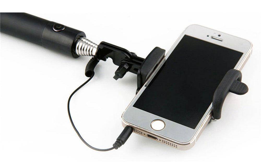 Итак, как же это всё работает? На самом деле всё очень просто. От вас требуется лишь подключение маленького провода к аудиоразъему, в который вы обычно вставляете наушники. Действуйте аккуратно, так как провод у дешевых моноподов держится, как говорится, «на соплях», его легко оторвать. У более качественных изделий этот кабель выглядит уже более надежно, с таким аксессуаром уже можно не церемониться.