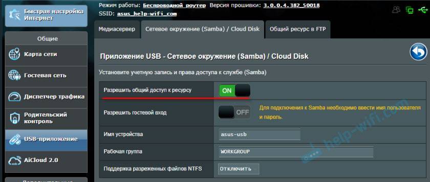 Нужно убедится, что в настройках роутера этот накопитель определен, и общий доступ к нему включен. Понятно, что на разных маршрутизаторах, это делается по-разному. На роутерах ASUS, например, это выглядит вот так: