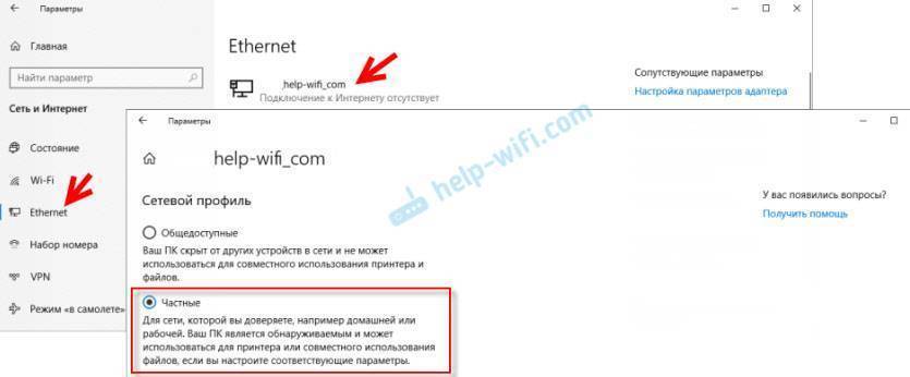 Для настройки локальной сети я рекомендую для Ethernet или Wi-Fi подключения установить сетевой профиль “Частные”. Ну и соответственно открывать общий доступ к файлам только в тех сетях, которым вы доверяете (которые вы контролируете). На тему смены сетевого профиля я уже писал подробную инструкцию: домашняя (частная) и общественная (общедоступная) сеть Windows 10.