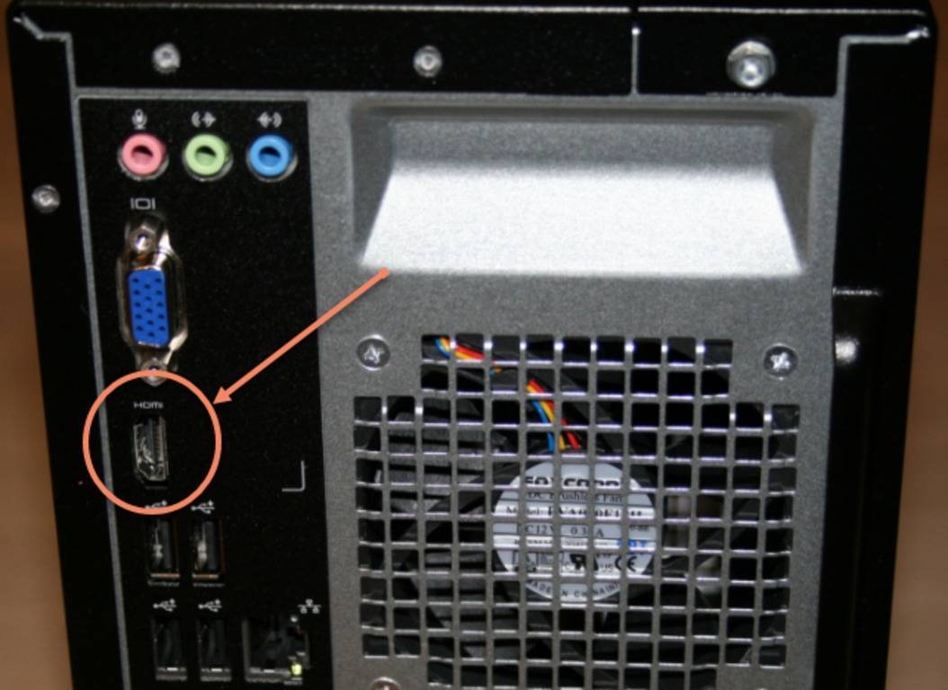Разъем на компьютере расположен в том районе, где располагаются разъемы DVI или VGA для подключения монитора (выход видеокарты). В том случае, если видеокарта интегрирована в материнскую плату, HDMI разъем будет находиться по соседству с разъемом сетевого кабеля RJ-45 и портами USB, при этом внешний вид у него будет такой же.