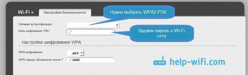 В настройках переходим на вкладку Wi-Fi – Настройки безопасности (если у вас английский язык меню, то смените его на русский). В выпадающем меню Сетевая аутентификация ставим WPA2-PSK. В поле Ключ шифрования PSK укажите пароль, который будет использоваться для подключения к вашей Wi-Fi сети. Только придумайте более сложный, чем мой “123456789”:) Пароль должен быть минимум из 8 символов.