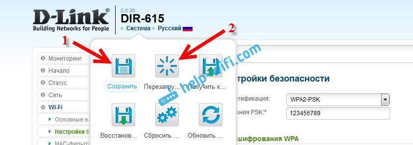 Дальше, наведите курсор на пункт меню Система (сверху). Сначала нажмите на кнопку Сохранить, а затем – Перезагрузить.