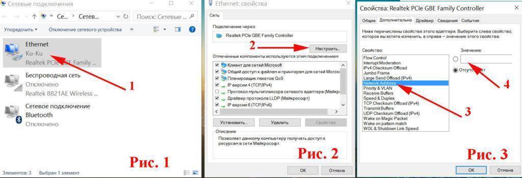 Выбираем активное сетевое подключение, клацаем на нем правой кнопкой мыши и нажимаем на строке «Свойства». В окне, которое выскочило, находим вкладку «Сеть» и жмем на кнопку «Настроить». Активируем сетевой адрес и вводим новый MAC.