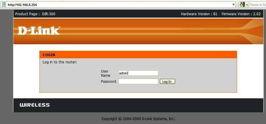 - В адресной строке браузера ввести подходящую комбинацию: для D-Link DIR-300, DIR-300S — 192.168.0.1, для модели D-Link DSL-2640U — 192.168.1.1.
