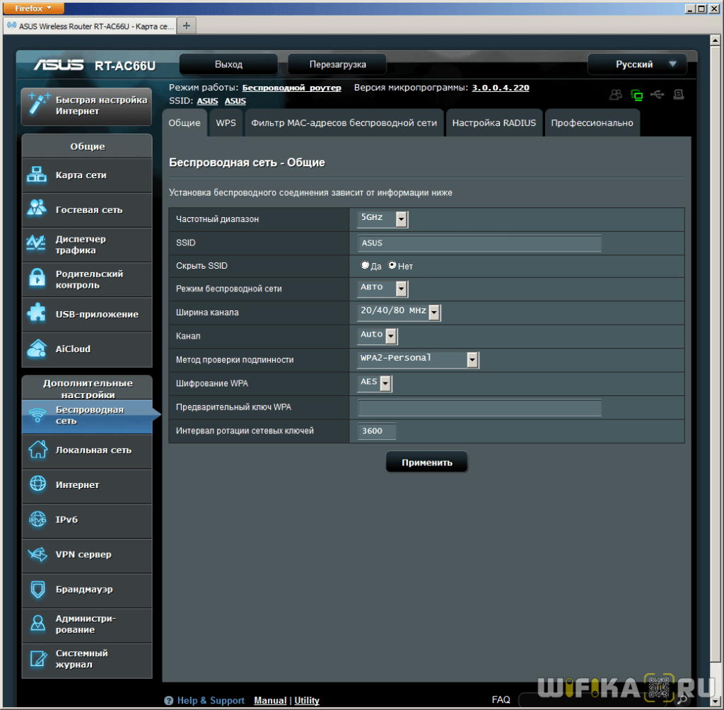 На роутерах Asus с современной админкой в черно-голубом цвете (Black Diaomond) просто входим в меню «Беспроводная сеть» и меняем значение пункта «SSID»