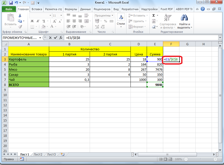 Можно посчитать процентную долю отдельных составляющих таблицы, даже если итоговая сумма не выведена в отдельную ячейку. После форматирования ячейки для вывода результата в процентный формат ставим в ней знак «=». Далее кликаем по ячейке, чью долю надо узнать, ставим знак «/» и набираем сумму, от которой рассчитывается процент. Превращать ссылку в абсолютную в этом случае не нужно.