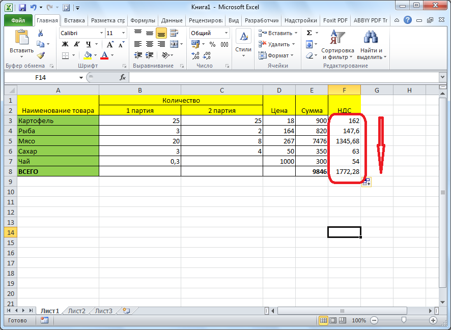 Копируем формулу в другие ячейки перетаскиванием вниз. Таблица с данными о сумме НДС готова.