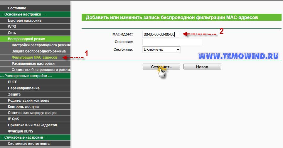 Удалить нежелательных клиентов на этой странице не выйдет. Для редактирования списка будет нужно перейти в меню MAC-фильтра. Здесь есть возможность добавить разрешенные адреса или же запретить некоторых клиентов Wi-Fi. Также избавиться от нежелательных устройств можно, усилив параметры защиты в соответствующей вкладке и изменив ключи.