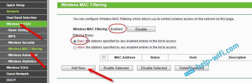 Фильтрация должна быть включена (в статусе Enabled). А настройки блокировки в статусе “Deny” (Запретить). Нажмите на кнопку “Add New” (добавить), что бы добавить новое устройство.