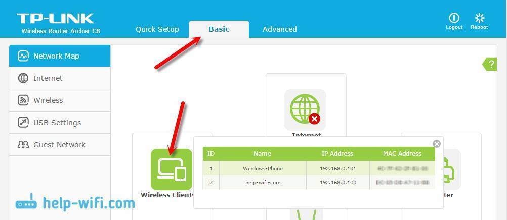 Некоторые топовые модели роутеров от TP-LINK, уже обзавелись новым веб-интерфейсом. В основном, это устройства из линейки Archer (но не все). В настройках, в новой панели управления, перейдите сверху в раздел “Basic” (базовая настройка). Вы увидите карту сети. Там будут беспроводные клиенты. Нажимаем на них, и сбоку, или снизу появится список устройств, которые подключен к вашему Wi-Fi.
