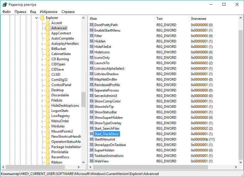 Нас интересует ключ DWORD — Start_TrackDocs, в котором будет стоять параметр 1. Меняем параметр на 0.