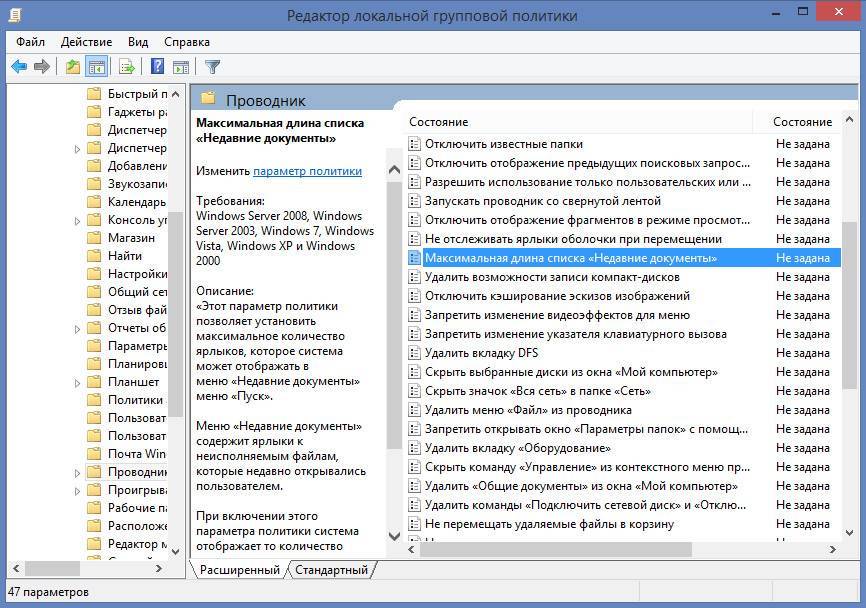 Отключение последних элементов с помощью групповой политики (все пользователи)