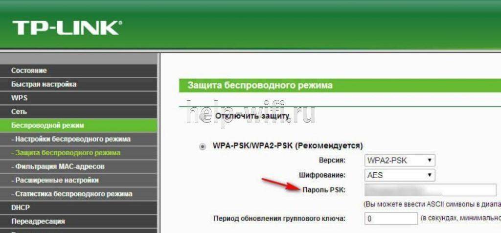 Чтобы поменять пароль на Wi-Fi в точках доступа компании TP-LINK, заходим в меню «Беспроводный режим» и переходим в подменю «Защита беспроводной сети», ищем строку «Пароль PSK» и изменяем ключ доступа. После этого жмем кнопку «Сохранить».