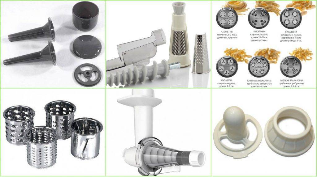 Стандартно сюда входит набор из трех разных перфорированных насадок для фарша. Так же есть насадки-терки, которые помогают быстро натирать овощи. Обычно такой комплект состоит из двух насадок с разными типами отверстий.