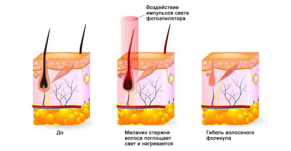 Принцип функционирования устройства для удаления нежелательных волос наделен термином «фототермолиз». Суть метода заключается в обработке кожи высокочастотными интенсивными вспышками света, вызывающие нагревание стержня и приводящие к гибели фолликула.