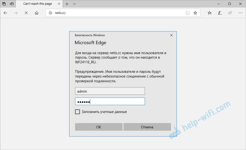 Сразу появится запрос этих данных. И будет появляться каждый раз, когда вы, или кто-то другой захочет получить доступ к настройкам маршрутизатора Netis WF2411E.