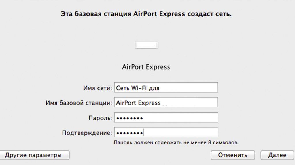 - Введите имя и пароль для AirPort Express, затем нажмите кнопку «Продолжить».
