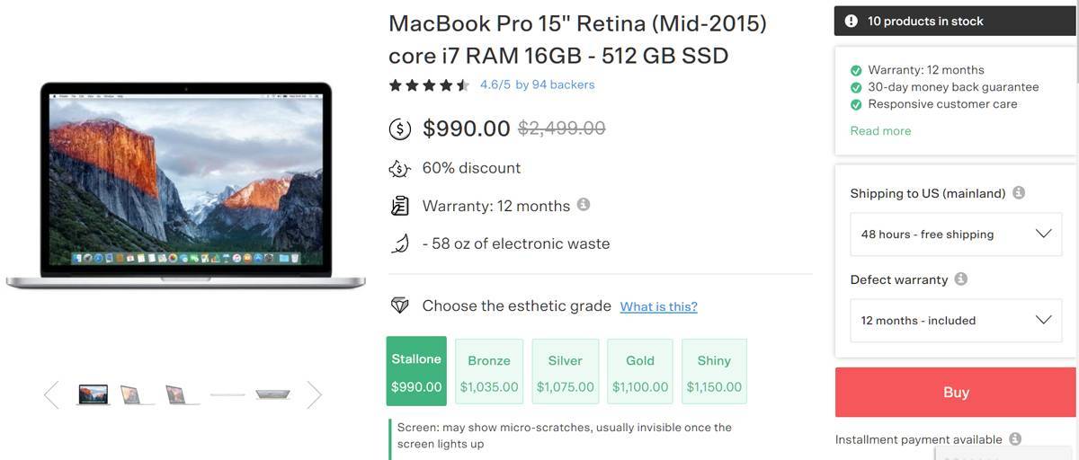 BackMarket. Популярный магазин, где продается только восстановленная электроника. Гарантия на все девайсы – минимум полгода. Скидки 40-70%, зависит от состояния устройства. Здесь под каждым девайсом есть шкала – от «Shiny» (блестяще!) до «Stallone» (Сильвестр Сталлоне, ага). Чем выше уровня вы просите девайс – тем больше платите. Для продавцов это тоже очень удобно: им не приходится вывешивать массу разных объявлений или пытаться подравнивать все устройства под одну гребенку. Они просто сортируют отремонтированные девайсы, а покупатели выбирают, что им больше по душе.