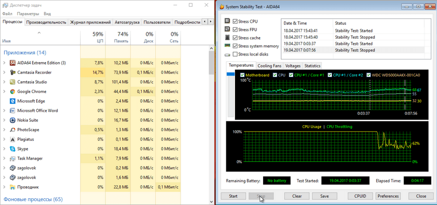 Существует несколько способов разгона процессора. ЦПУ способен дать максимальную загрузку, когда происходит архивирование документов, при обработке видеофайлов в программах, таких как Camtasia Studio, ProShow Producer и др. В момент работы этих программ можете вызвать Диспетчер задач и понаблюдать за динамикой CPU.