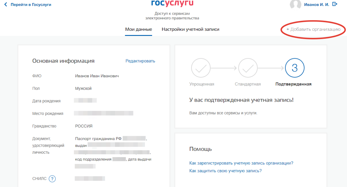 - Зарегистрировать личную учетную запись и подтвердить ее в отделении МФЦ. Регистрация юридического лица возможна только из личного кабинета физлица. Поэтому руководителю или представителю организации сначала нужно зарегистрироваться самому. Если личный кабинет уже есть, можно сразу перейти к следующему этапу.