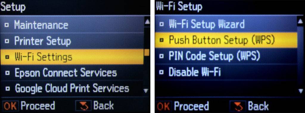 На WiFi принтере при помощи клавиш навигации войдите в пункт «Wi-Fi Settings», или «Беспроводные подключения». Потом в данном разделе, выбираем способ соединения «WPS».