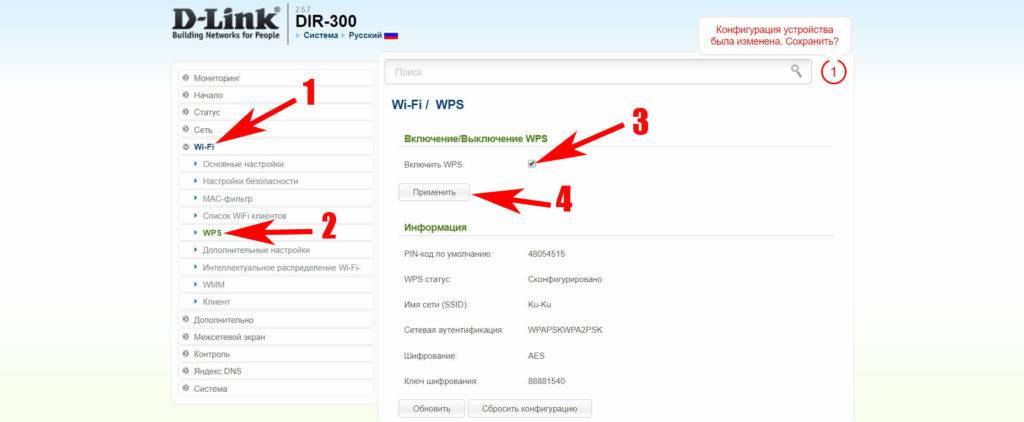 - далее, в открывшемся окошке нажимаем «security» — «enable WPS» — «enabled» (для D-link) или отдельный пункт WPS слева (для TP-link);