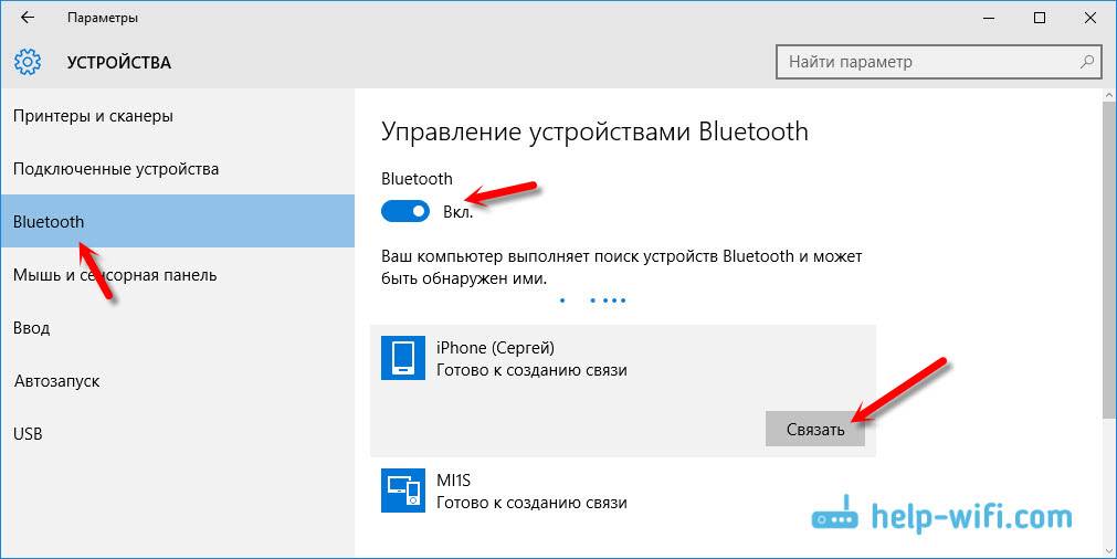 После запуска режима модема, переходим к компьютеру. Зайдите в панель управления, вкладка “Устройства” – “Bluetooth”. В списке доступных должен появится наш iPhone, или iPad. Выбираем его, и нажимаем на кнопку “Связать”.