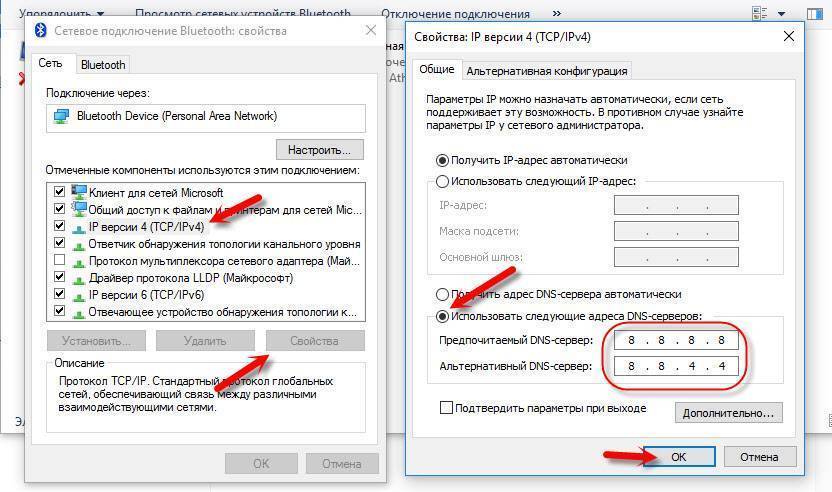 По идеи, после этих действий, интернет на компьютере уже должен работать. Но, у меня почему-то сайты не открывались. Решил я эту проблему заменой DNS-адресов. Зайдите в “Сетевые подключения”, нажмите правой кнопкой на адаптер “Сетевое подключение Bluetooth”, и выберите пункт “Свойства”. Затем, выделите пункт “IP версии 4 (TCP/IPv4)”, и нажмите на кнопку “Свойства”.