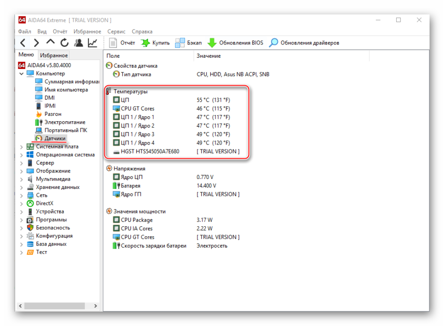 - Запустите программу, нажмите на иконку «Компьютер». Её можно найти либо в левой части окна, либо в центральной. После перейдите в «Датчики». Их расположение аналогично с «Компьютер».
