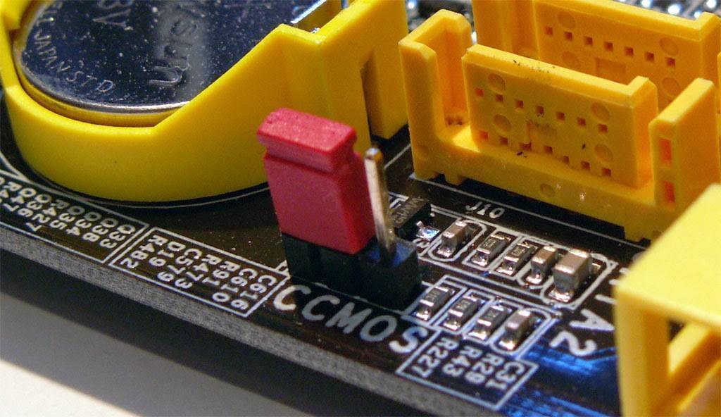 Чаще всего переключатель расположен недалеко от батарейки, а перемычка обычно подписана надписями типа CLRTC, CLR и CCMOS.