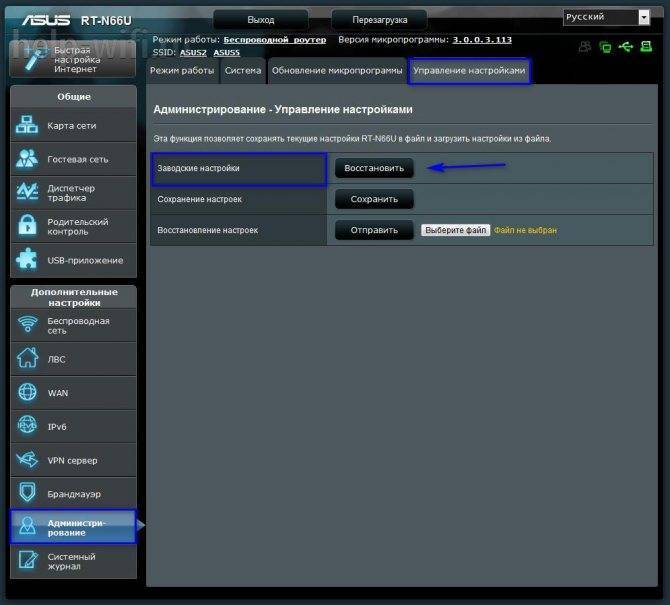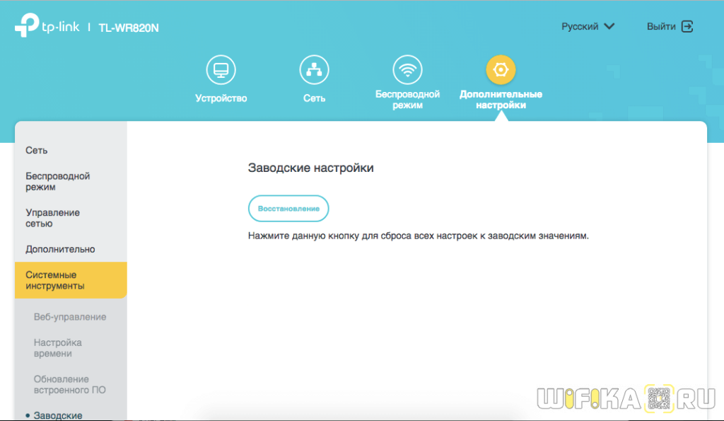 Здесь достаточно просто нажать на кнопку «Восстановить» и роутер обнулится до состояния «из коробки»