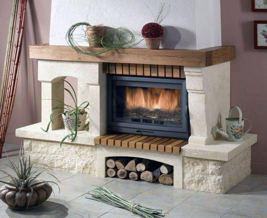 Для таких моделей зазор между задней плоскостью аппарата и стеной выдерживается не менее 50 мм. Исходя из этого, рассчитываются габариты будущего каминного портала. Для облицовки можно взять керамическую плитку, фактурный керамогранит. Превосходно смотрится гипсовая лепнина.